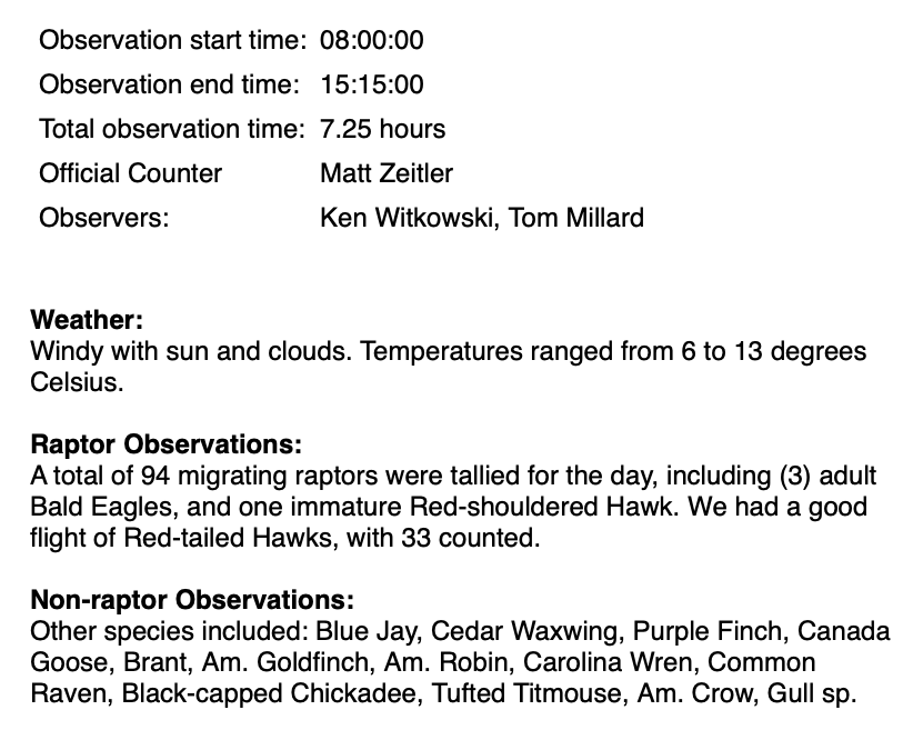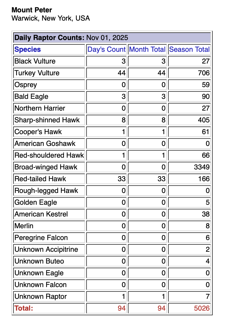 Today was my favorite type of day for hawk watching. It was cool with a very strong WNW wing all day long. It really feels like November, and it’s a day that’s just chock full of potential. And, while we didn’t get either of the sought after rarities (Golden Eagle, American Goshawk), I did enjoy a pretty good flight with over 90 migrating raptors coming through. Fellow counters Tom Millard and Ken Witkowski joined me and for the day we tallied (44) Turkey Vultures, (3) Black Vultures, (3) adult Bald Eagles, (33) Red-tailed Hawks, (8) Sharp-shinned Hawks, (1) Cooper’s Hawk, and (1) Red-shouldered Hawk. As usual, I’ve included my Hawk Migration Association report at the bottom of this post.