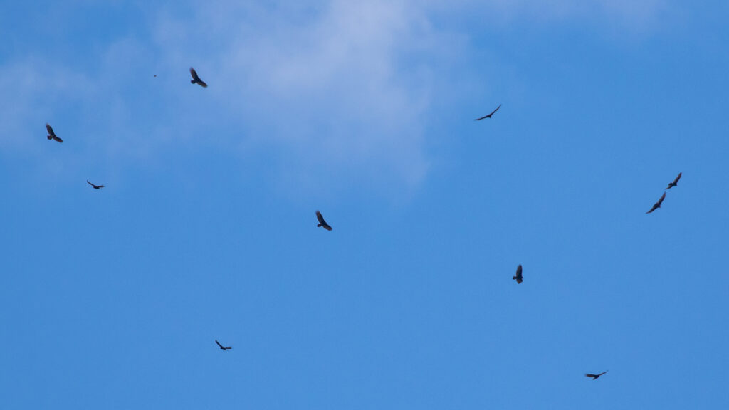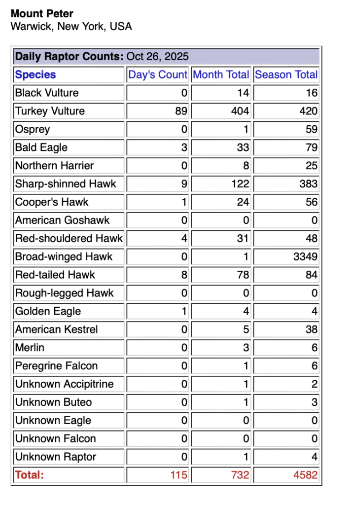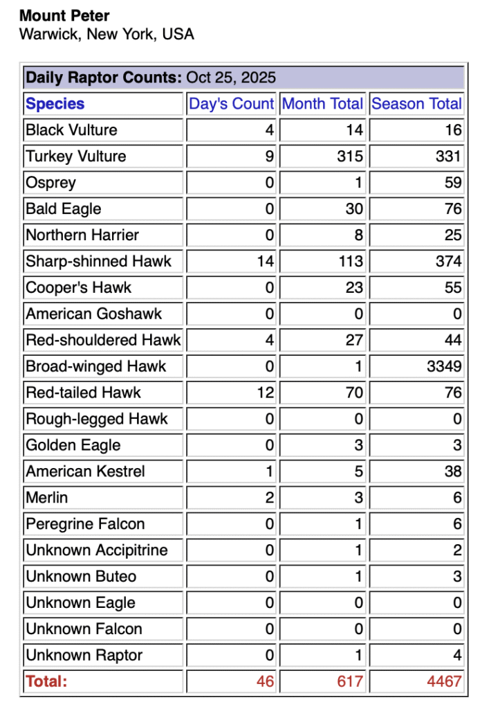This weekend I counted at Mt. Peter Hawkwatch on Saturday, as usual. I also covered for another counter on Sunday, so I spent nearly 15 hours up at the mountain in two days. I tallied 161 migrating raptors over the two days, but he highlight, by far, was an immature GOLDEN EAGLE, which I located to the east of the platform during the second hour of Sunday’s watch. Unfortunately, the bird went behind the stand of trees to the on that side of the platform before I was able to even attempt a photo. Other noteworthy raptors included my first migrating Merlins of the year (three over the two days), and I enjoyed a substantial flight of Turkey Vultures during the final hour of the watch on Sunday, with over 75 migrants counted.