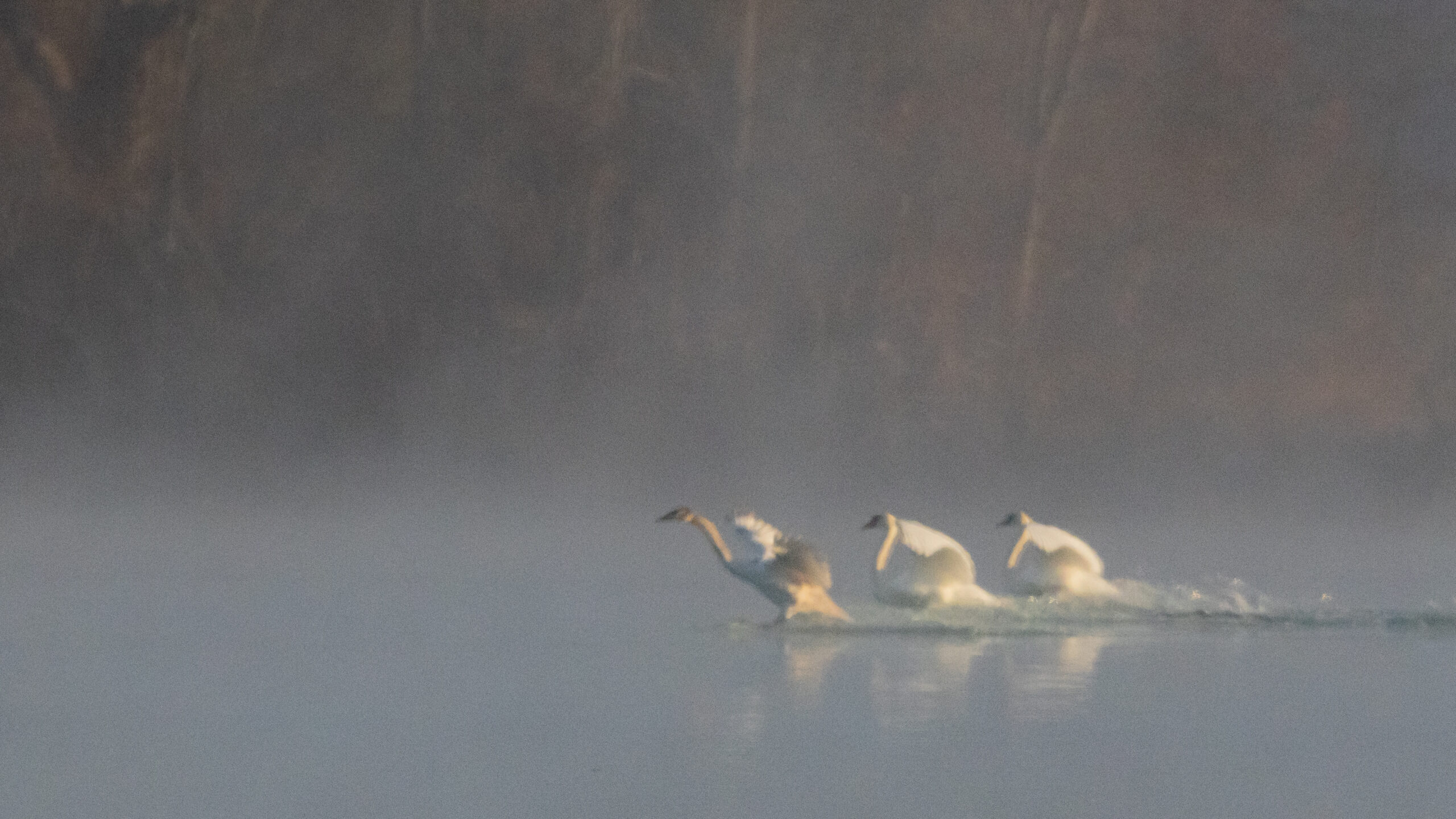 ~Mute Swans on a foggy morning at Wickham Lake, 11/02/25.~