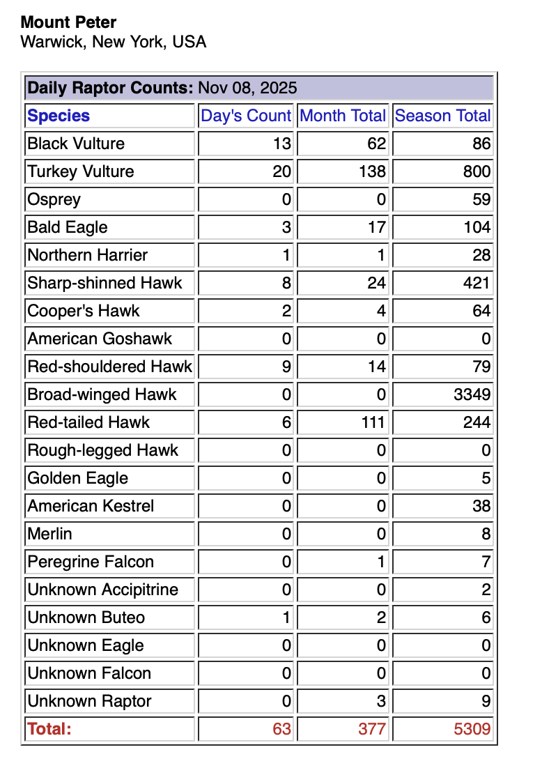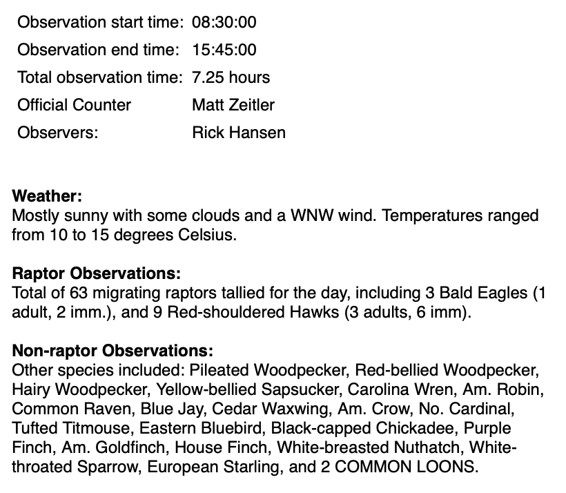As for Hawkwatch, it was a busy enough day where I tallied over 60 migrating raptors with the help of fellow counter Rick Hansen, who joined me for a couple of hours. Raptor highlights included (3) Bald Eagles and nice flight of (9) Red-shouldered Hawks. Other highlights included numerous Common Ravens – I’d say I had at least thirty of them today. Also exciting was (2) Common Loons flying over – I always enjoy seeing them in migration. As always, I’m including my Hawk Migration Association report at the bottom of this post.