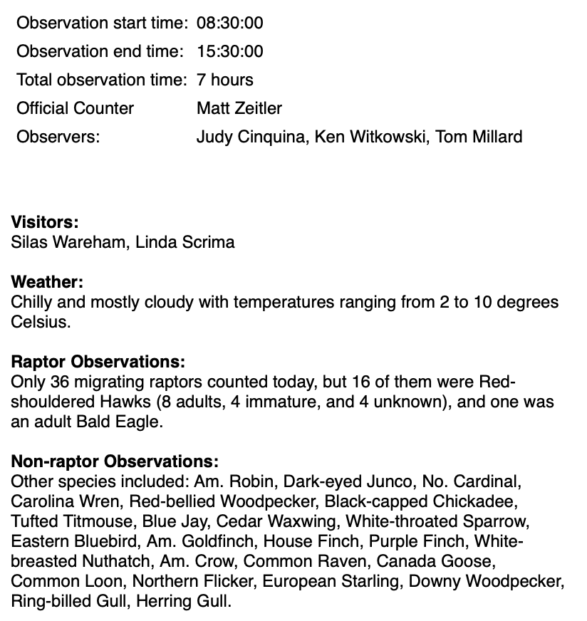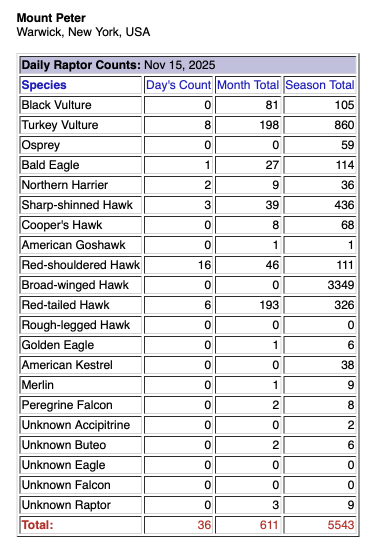 Sadly, today was the last day of the season at Mount Peter Hawkwatch. I was joined by fellow counters Judy Cinquina, Tom Millard, and Ken Witkowski, as well as birding buds Linda Scrima and Silas Wareham. For the day, we tallied a total of only 36 migrating raptors, but 16 of them were Red-shouldered Hawks, and that’s a pretty good flight of Red-shoulders for Mt. Pete. Other highlights included (3) Common Loons, several Ring-billed Gulls, and a single American Herring Gull. As always, I’ve included my Hawkcount.org report at the bottom of this post.