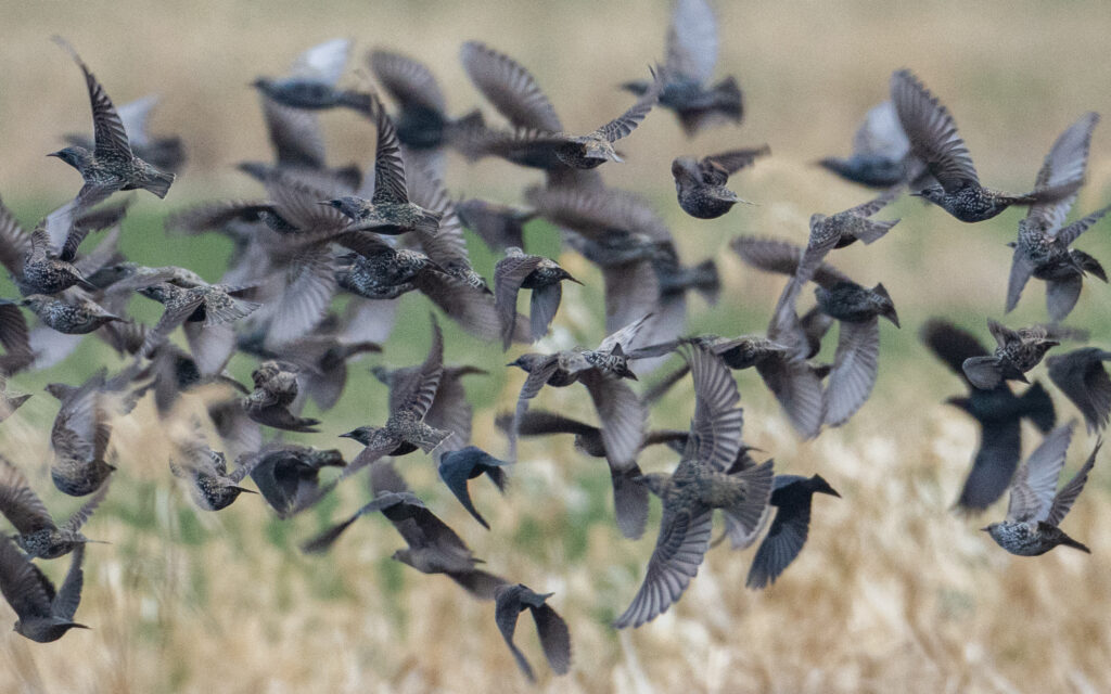 ~European Starlings in flight in the black dirt, 11/30/25.~