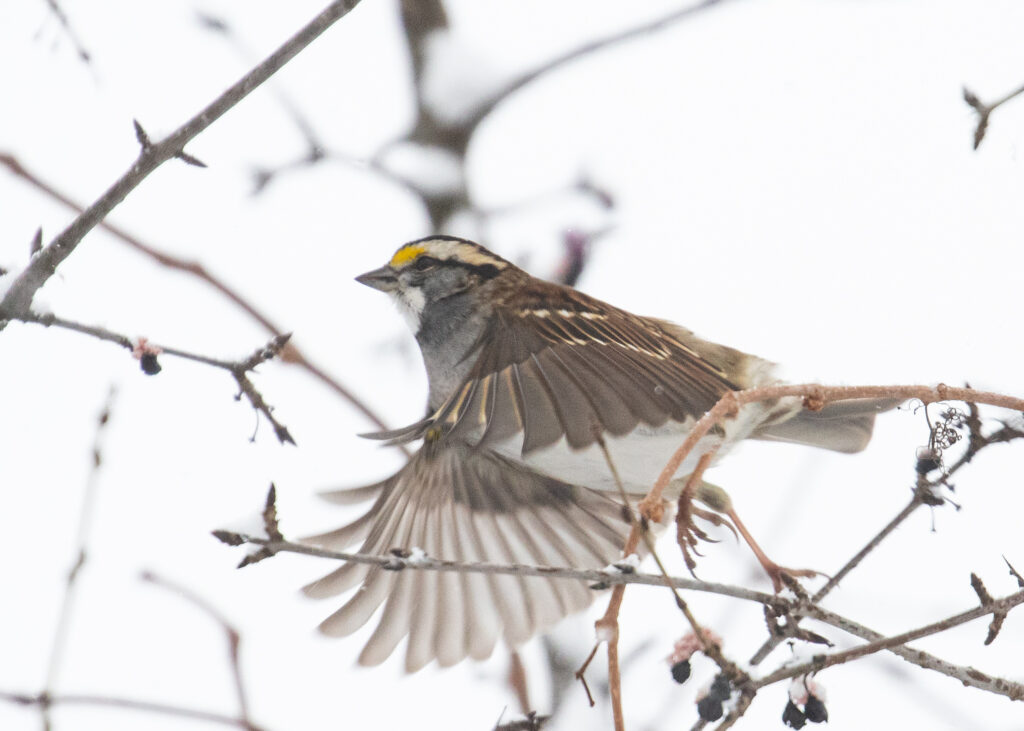 ~White-throated Sparrow taking off. Winding Waters Trail, 01/18/26.~~White-throated Sparrow sitting in the snow at Winding Waters Trail, 01/18/26.~~I had my first Great Blue Heron of 2026 at Memorial Park in Warwick this morning, 01/18/26.~~In the field I thought this was a House Finch. Looking at the photo now, I’m thinking it’s likely a Purple Finch. Black Rock Forest on 01/17/26.~
